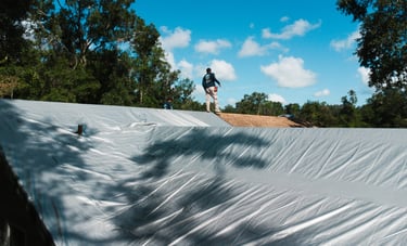 Our innovative Shrink Wrap Roof, Blue Tarp and Grey Tarp technology